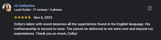 After some adjustments on the wood, Colby with all his talent gave birth to my project. A remarkably beautiful board with perfect finishes! My parents were really amazed at the work done.I was not the easiest customer I’m sure but, Colby took up the challenge by creating this unique and exceptional piece! So 1000 thanks for your work, your talent, and your patience! We can see your passion in each of your works.”