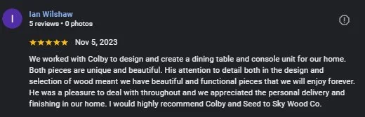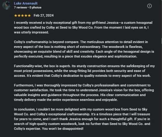 “‘I found the perfect anniversary gift for my husband from Seed to Sky Wood Company. The traditional 5th-anniversary gift is crafted from “wood” which symbolizes the long-lasting strength of a marriage bond, wisdom, and forgiveness. Seed to Sky Wood Co. had a beautiful selection of charcuterie boards, but I wanted something customized for my husband. I shared with Colby what I wanted and he was able to create the perfect, unique pieces of artwork for me. His work is outstanding! The wood is so smooth and soft, with a blue epoxy river running through the middle of the board and a special quote which follows the flow of the river just perfectly. We actually won’t be using it as a charcuterie board but will be hanging it in our house as a beautiful piece of art. Colby was great to work with, he completed the work in plenty of time for our anniversary and communicated with me throughout the entire process. Colby's work is the best! I will definitely be making more purchases in the future!’’